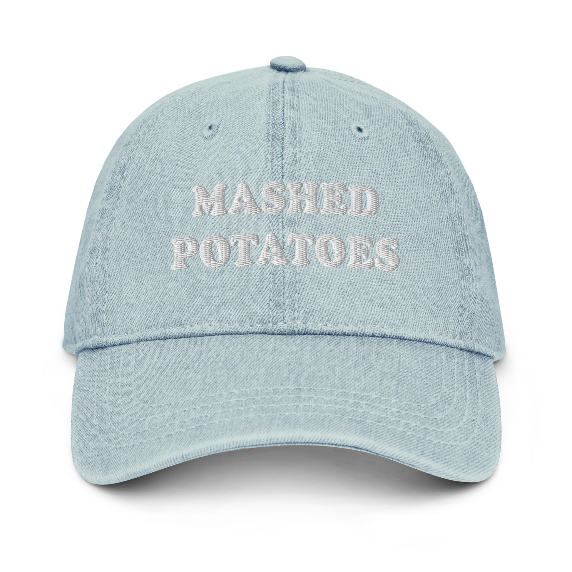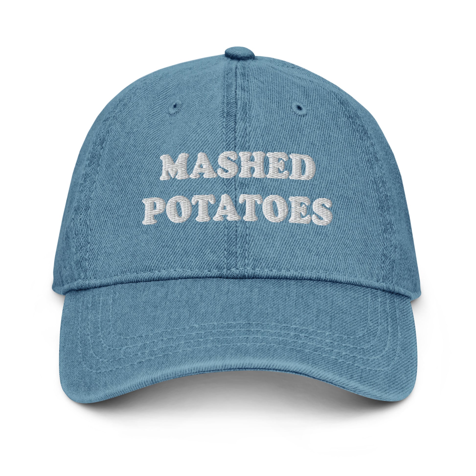 Are you a big fan of mashed potatoes? Our Mashed Potatoes Hat is comfortable, adjustable and made just for you! It's a pigment-dyed denim hat with a "mashed potatoes", expertly embroidered on the front. Made out of 100% cotton and perfect for everyday wear or a gift for a mashed potato enthusiast.